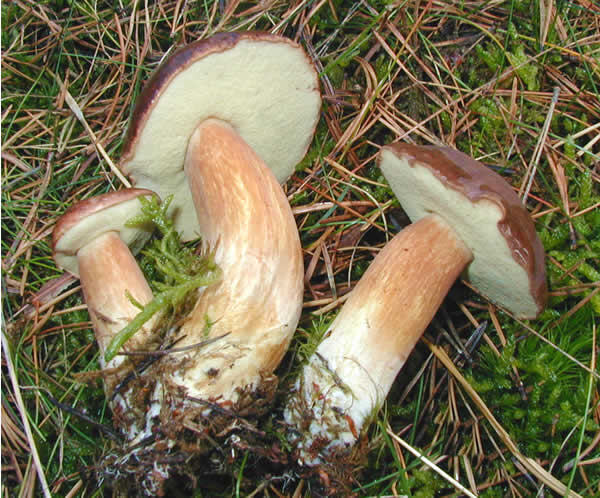 Convex, dark brown. The reddish brown to tarnished brass colored pileus is viscid when wet. Both the white context and greenish-olive tubes turn blue when cut. pore colour : khaki.