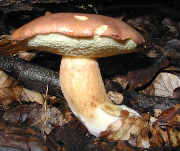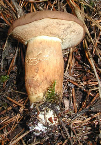 Stipe : The similarly colored stipe is non-reticulated and pruinose. The flesh is white |