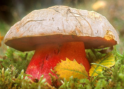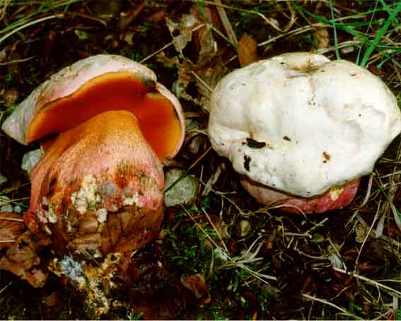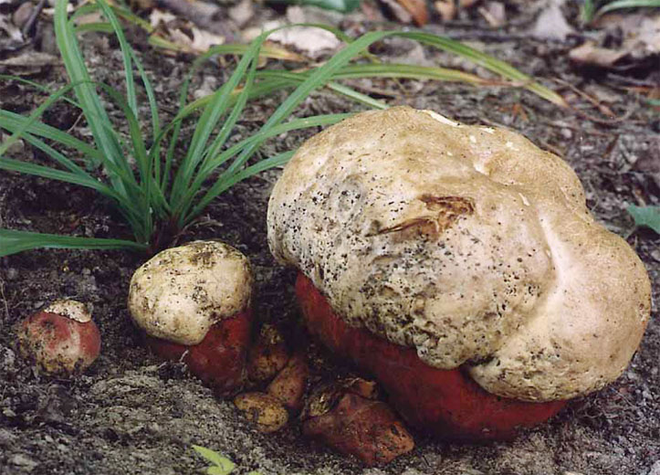 Stipe :  Bulbous, 10-12 x 5-10 cm; upper part yellow, toward base carmine-red, sometimes only at the base red; upper part with yellowish to red reticulation.